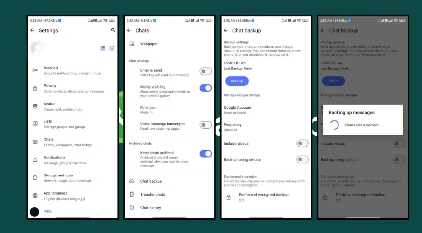 - Backup Chats: Go to Settings > Chats > Chat Backup and save your data.